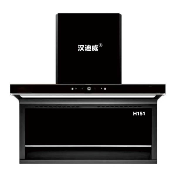 1、七字烟机,黑色烤漆箱体,顶侧双吸。