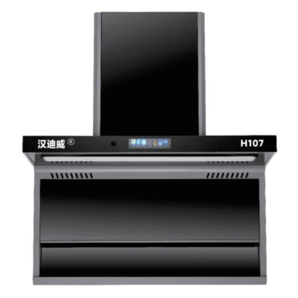 1、七字烟机,烤漆箱体,背板带弧形玻璃便于清洗。